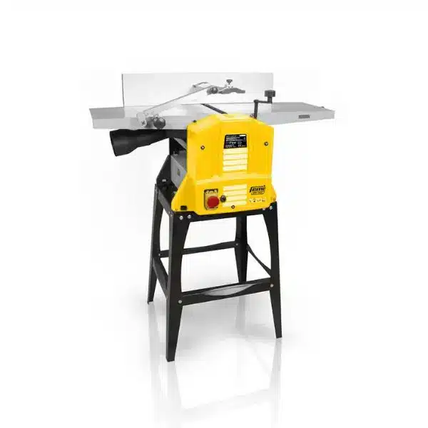 Conception et assemblage italien (Femi SpA, Castel Guelfo di Bologna), pietement fourni inclus dans le prix a stabiliser sur plan lourd. Table degau de 920 mm pour le corroyage de pieces longues. Fers HSS reaffutables qui prolongent la duree de vie par rapport aux consommables jetables. Guide parallele genereux (635 × 124 mm) pour un dressage confortable.