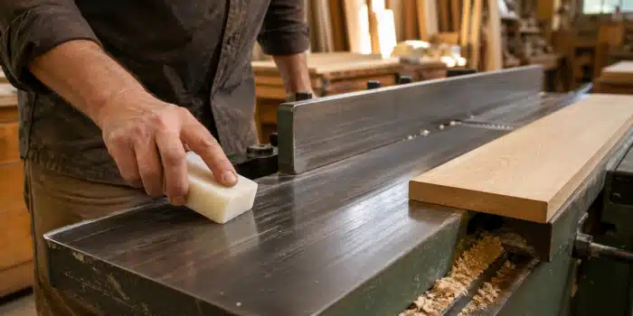 Mon choix préféré : la cire d’abeille. Elle ne s’accumule pas en couche grasse, elle offre une glisse durable, et elle ne gêne ni le collage ni le vernissage. Je l’applique sur toutes mes machines, tables et glissières.