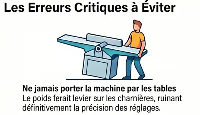 Transporter la machine par les tables. C’est l’erreur numéro un. Je l’ai vue faire par des livreurs, des voisins bien intentionnés, des déménageurs. Une dégauchisseuse-raboteuse se porte par le bâti, jamais par les tables. Le poids de la machine fait levier sur les charnières et les points de réglage. Quelques dixièmes de décalage suffisent à produire un bois qui part en banane après six passes.