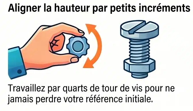 La parade, c’est le serrage progressif en trois passes avec vérification entre chaque. Approche d’abord, du centre vers les extrémités. Serrage modéré. Blocage. Et à chaque étape, on reprend le tasseau ou le comparateur. Le comparateur ne remplace pas le tasseau : il le complète. On positionne le fer au tasseau, puis on vérifie au comparateur que la hauteur est uniforme sur toute la longueur et d’un fer à l’autre. Si ça a bougé, on desserre légèrement, on recale, on resserre. Avec la méthode du tasseau, comptez une bonne quarantaine de minutes pour deux fers, facilement une heure pour trois. Au comparateur, la mesure est plus rapide, mais le cycle de serrage-vérification reste le même.