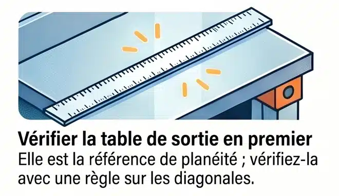 Tout part de là. Vos deux tables, la table d’entrée (celle où vous posez le bois) et la table de sortie (celle qui le reçoit après la coupe), doivent être dans le même plan quand la table d’entrée est en position zéro. Si elles ne le sont pas, aucun réglage de fers ne rattrapera le défaut. Vous pouvez positionner vos lames au centième, si les tables font un V ou un toit entre elles, le bois sortira bombé ou creux sans explication apparente.